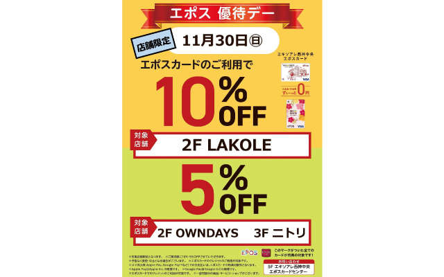 11月30日(日)3店舗限定での割引! 10% 2F LAKORE 5% 2F OWNDA ...