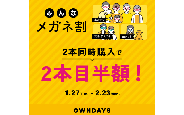【OWNDAYS】「みんなメガネ割」スタート!みんなで買うともっとお得に。2本同時購入で2本目“半額”!!